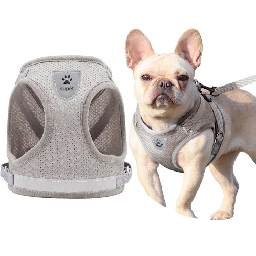 Arnés pechera, tipo chaleco, raza mediana con cierre velcro y argolla para correa, recubierto con tela transpirable, cinturón ajustable y tira reflectiva para no perder de vista a tu perro durante la noche, color gris. Medida: Circunferencia de pecho hasta 45cm. Talla única.