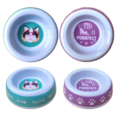 Plato de melamina para gato con diferentes diseños. Dimensiones: Diámetro interno 9 cm, Diámetro Externo 14 cm, Altura 3,5 cm. La melamina es resistente a caídas, tiene una larga vida y libre de BPA.