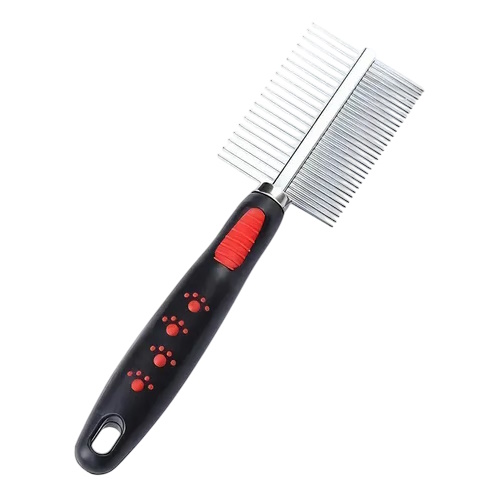 Este peine doble es la herramienta ideal para mantener el pelaje de tu mascota suave y saludable: - Dientes separados: diseñados para eliminar fácilmente nudos, enredos y motas sin lastimar. - Dientes juntos: perfectos para el peinado final, dejando el manto liso y brillante. Fabricado en acero inoxidable resistente, no se dobla ni se rompe al trabajar con nudos difíciles. Sus puntas redondeadas protegen la piel y brindan un suave masaje durante el cepillado. Recomendado para perros y gatos de pelaje medio y largo. El mango ergonómico con detalle de goma antideslizante asegura un agarre firme y cómodo en cada uso.
